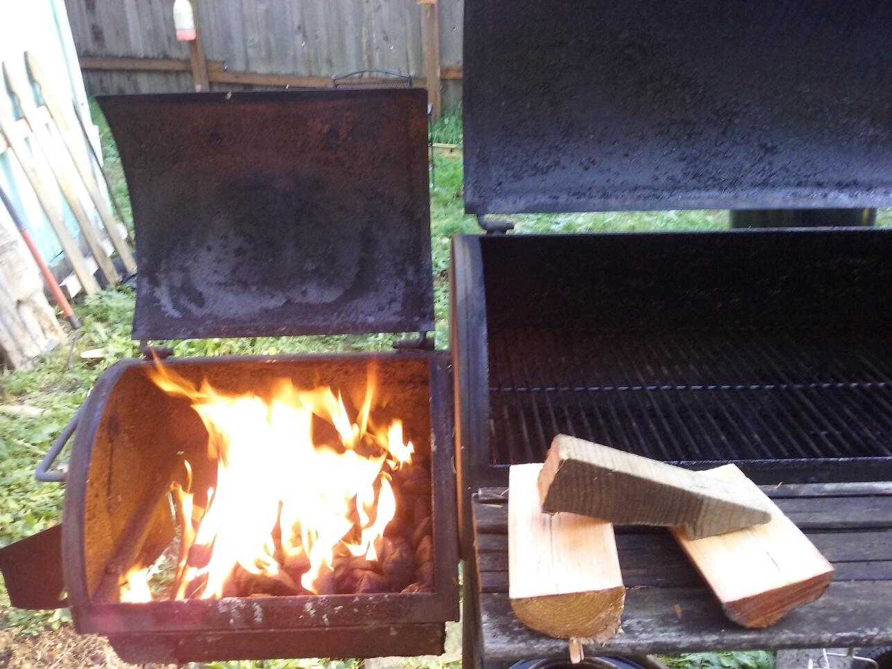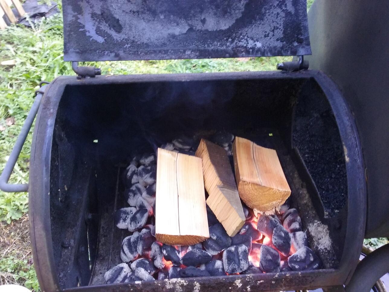 Preparing the grill includes cleaning it then, cutting some wood (alder and apple shown) and finally starting a fire. Then when the coals are ready place the wood on the hot coals, dial the temperature down to 250 f.