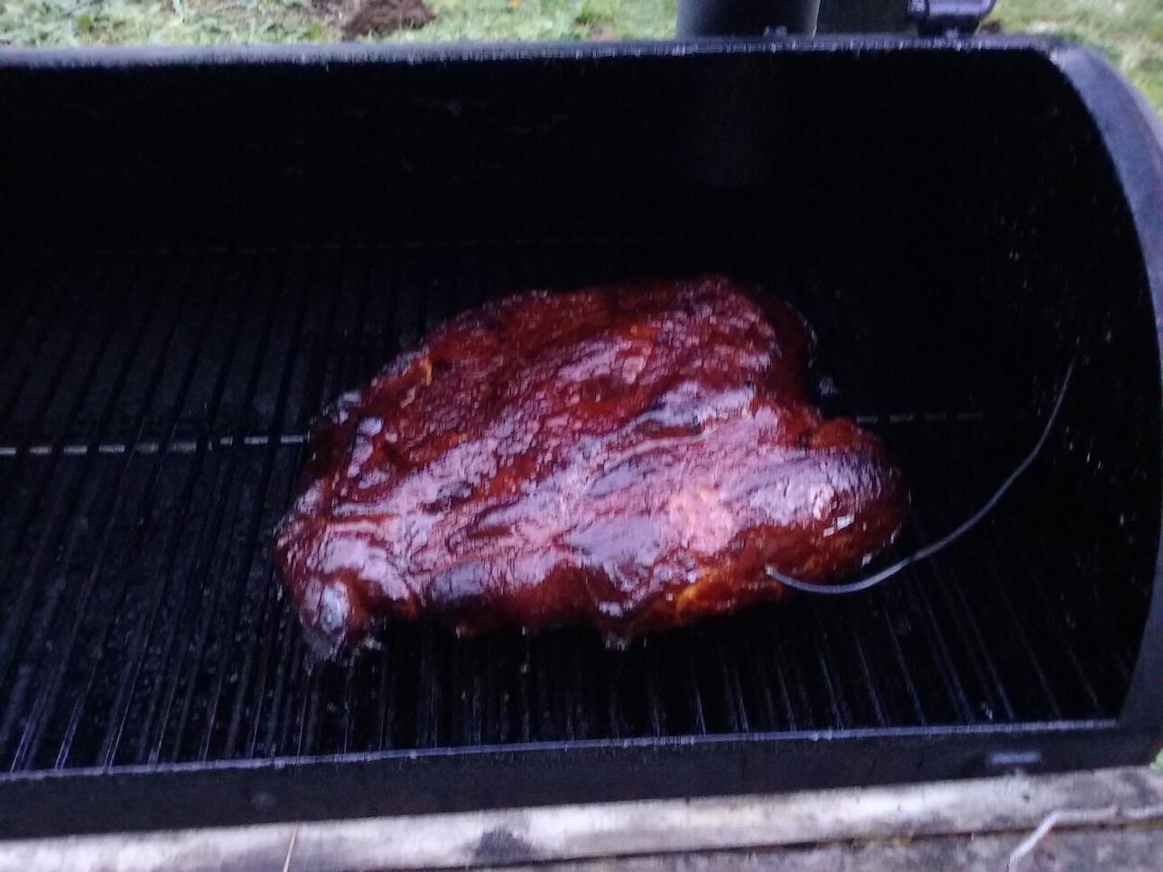 Place the ham and insert the meat probe. I use a digital meat probe that transmits the temperature to the reciever. The reciever has all the alarm setpoints on it. That means watch the game and not the meat. I do check the grill temperature and smoke about every 20 minutes.