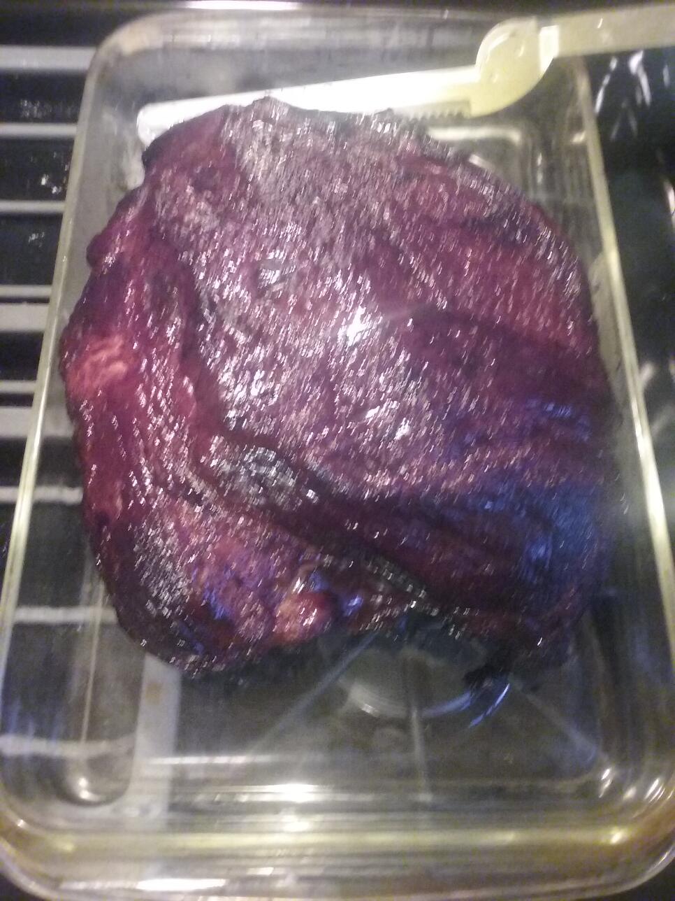 The finished product. Added coals a couple times to maintain heat. The last hour bumped the heat up to 320F to finish the cooking. Pulled the ham off at 145 F internal temperature and smothered it with a pineapple sauce. 20 oz can of pineapple minced in a food processor. 1 cup brown sugar and 1 cup water. Put the pineapple, water and brown sugar in a sauce pan and reduce. Dump it on the sliced ham.