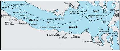 The WDFW consider Port Angeles as "Marine Area 6". Just click on the image to be taken to the WDFW website and the description of the Marine Area and rules. Males only 6.25" and catch record required, any gear - but verify.