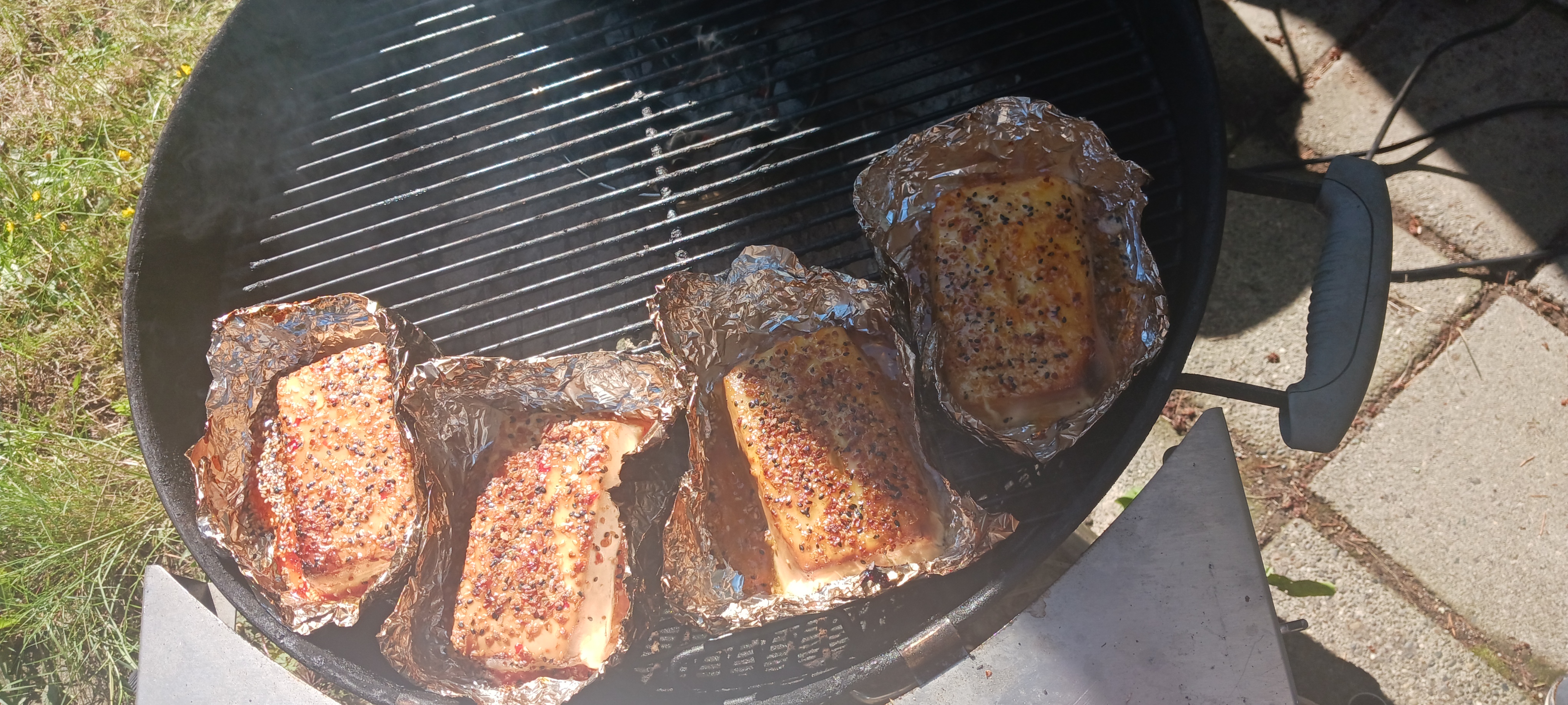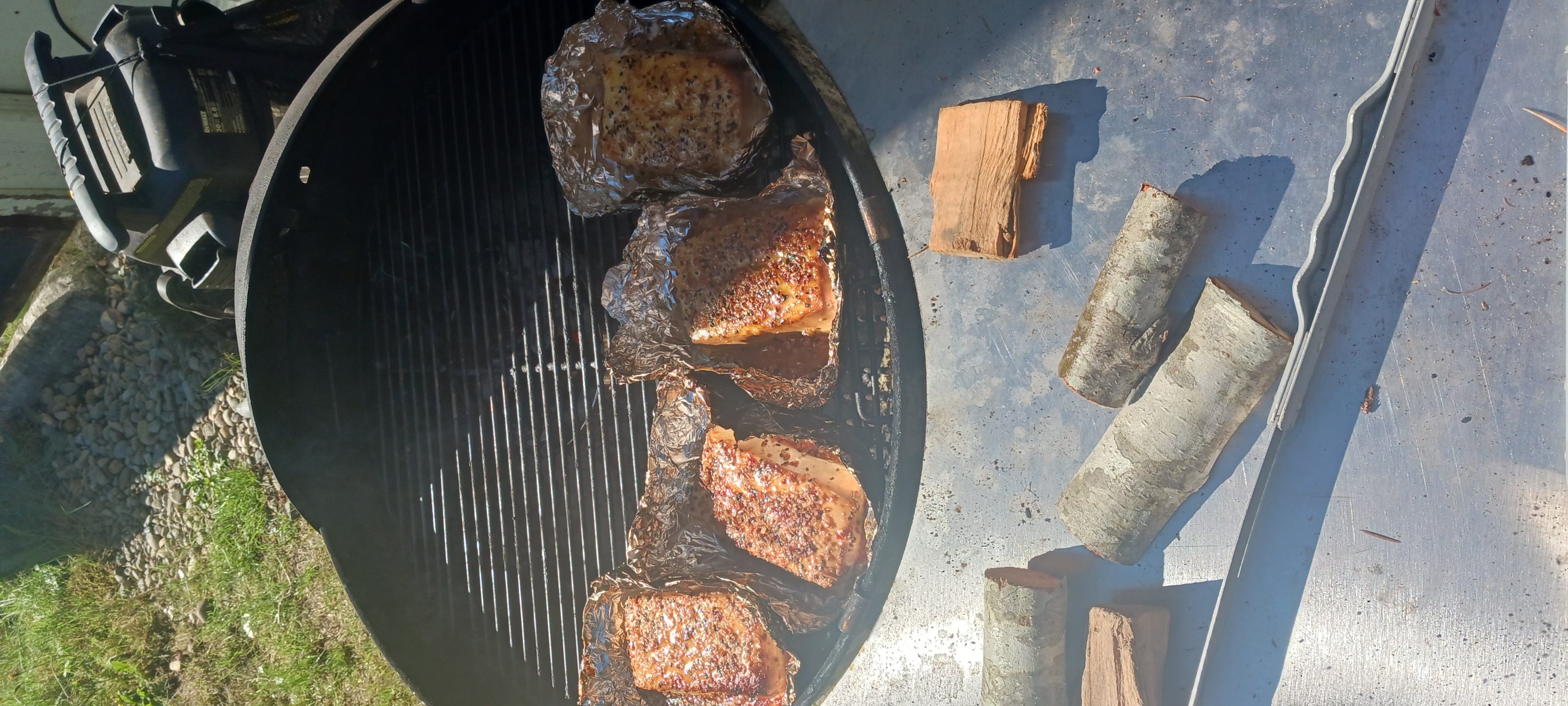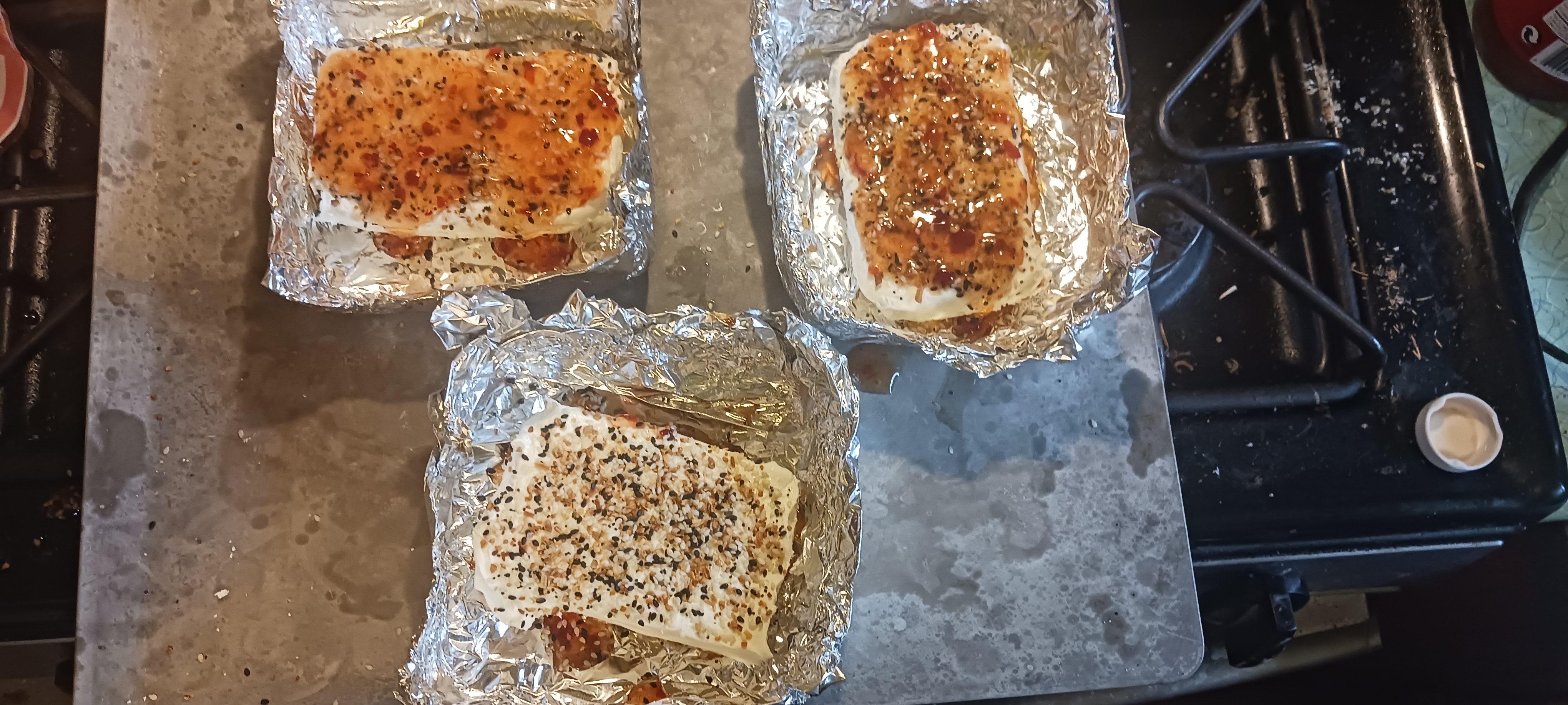 The response to the smoked cream cheese has been overwhelming. The first batch insipired a second then a third all of which were shared to the circles we run in. Unlike traditionally cold smoked cheese cream cheese is smoked in a hot smoker at 250 F for about 2 hours. We found 90 minutes of hot smoke in our favorite 22" kettle grill worked perfect. Then another 30 minutes with your favorite jam on the cheese. A stainless steel basket held the charcoal, offset, with a couple plugs of alder and apple wood on top of the coals. In other words, do not put the cream cheese directly over the coals and wood. The cream cheese is prepared by putting a bunch of "Everything Bagel Seasoning" on both sides of the cream cheese. Aluminum foil boats just big enough to support the blocks of cream cheese were used on the grill. After 90 minutes of hot smoking we poured Thai Sweet Chili sauce on one, Peach Jam on another and Maple Syrup on the last. All were delicious. Straight off the grill its all melty and cracker dipping ready. Though the next day after sitting in the fridge the smoke seems to blossom.