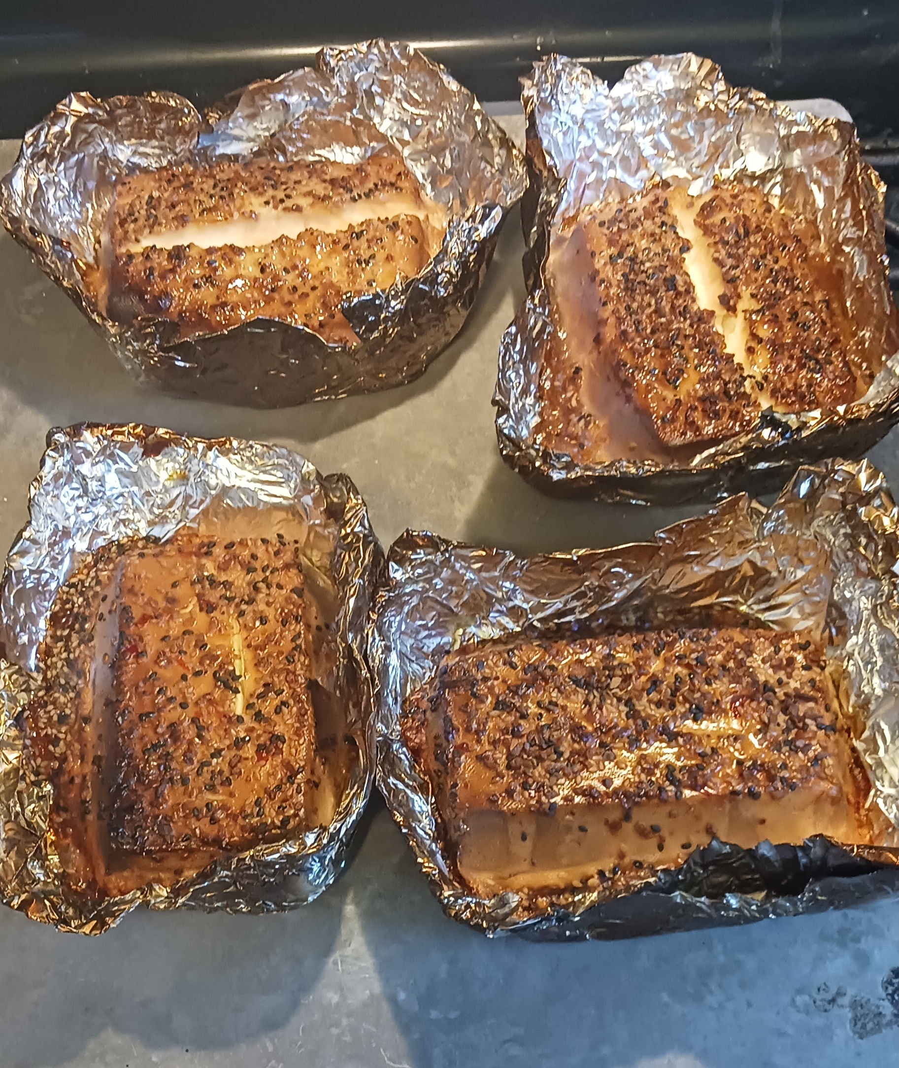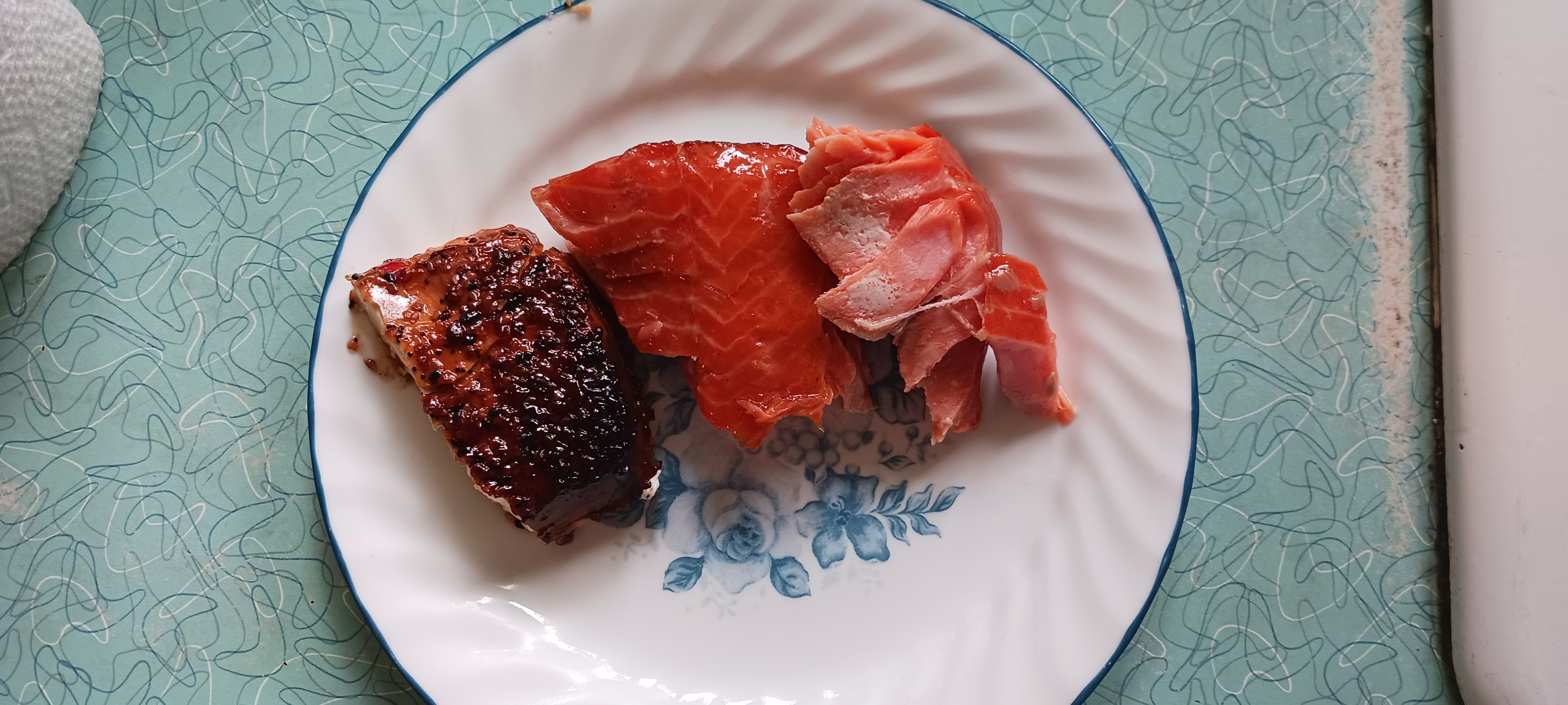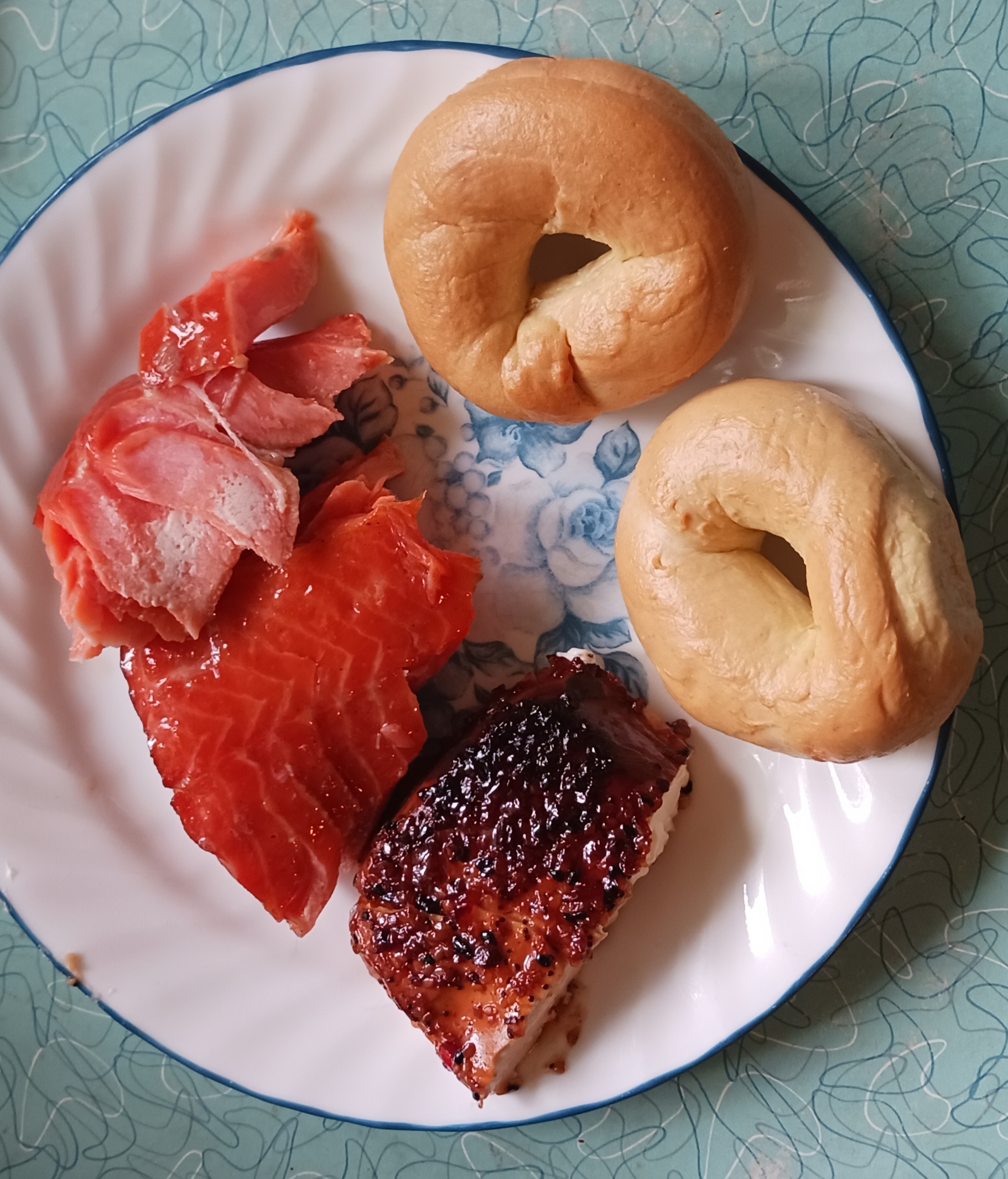 The response to the smoked cream cheese has been overwhelming. The first batch insipired a second then a third all of which were shared to the circles we run in. Unlike traditionally cold smoked cheese cream cheese is smoked in a hot smoker at 250 F for about 2 hours. We found 90 minutes of hot smoke in our favorite 22" kettle grill worked perfect. Then another 30 minutes with your favorite jam on the cheese. A stainless steel basket held the charcoal, offset, with a couple plugs of alder and apple wood on top of the coals. In other words, do not put the cream cheese directly over the coals and wood. The cream cheese is prepared by putting a bunch of "Everything Bagel Seasoning" on both sides of the cream cheese. Aluminum foil boats just big enough to support the blocks of cream cheese were used on the grill. After 90 minutes of hot smoking we poured Thai Sweet Chili sauce on one, Peach Jam on another and Maple Syrup on the last. All were delicious. Straight off the grill its all melty and cracker dipping ready. Though the next day after sitting in the fridge the smoke seems to blossom.