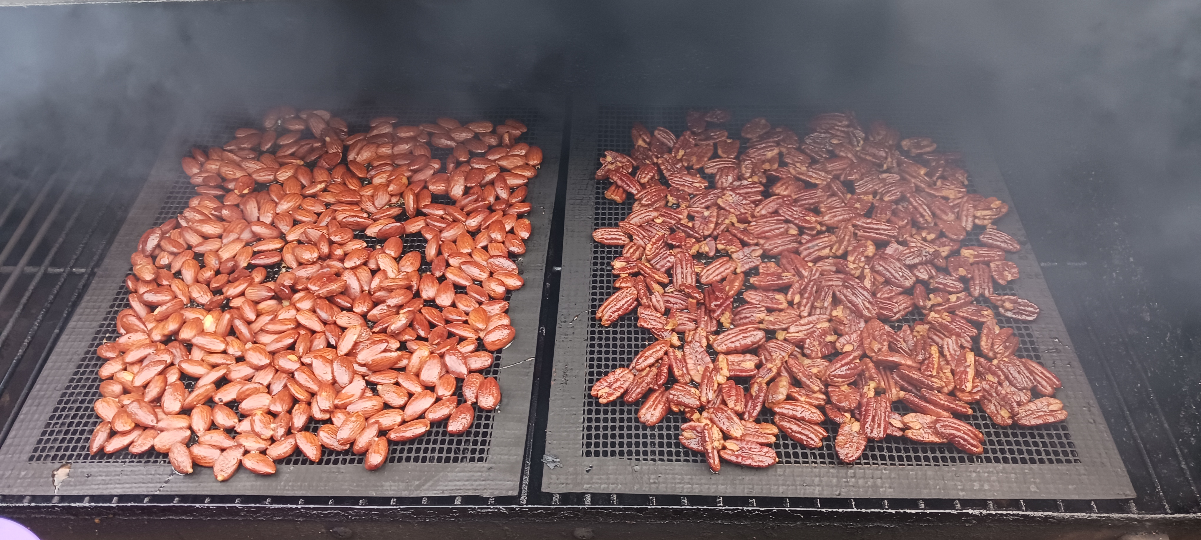 This is the newest product I've put on the smoker.  The picture shows a mat that I purchased for smoking items that migh fall through the grate.  For example: oysters and now nuts.  These are pecans and almonds.  As recommended hot smoking them at about 250 F for about an hour seemed to be the correct answer.  Doused with maple syrup and an egg white the first try was a victory.  The next iterations will include versions of the winter spices: Cinnamon and the like, poultry seasoning and something with a cajun flare.
