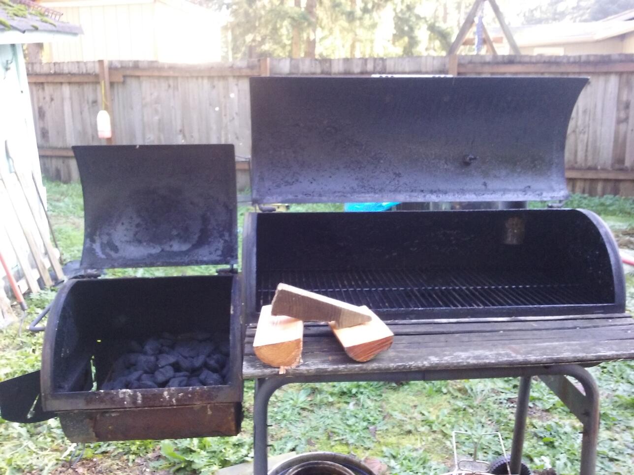 Preparing the grill includes cleaning it then, cutting some wood (alder and apple shown) and finally starting a fire. Then when the coals are ready place the wood on the hot coals, dial the temperature down to 250 f.