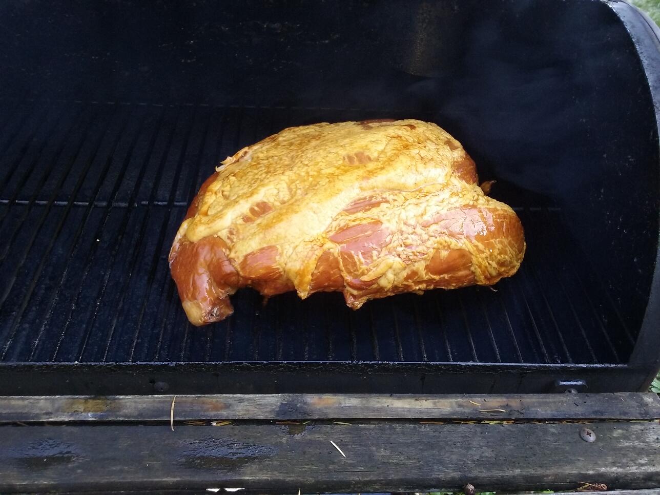 Normally use a ham that is already cooked. Brine it in apple juice for 2 days, in the fridge, then to the smoker. Hams that are already cooked only need to get up to serving temperature. Click on the image to biggy size it.