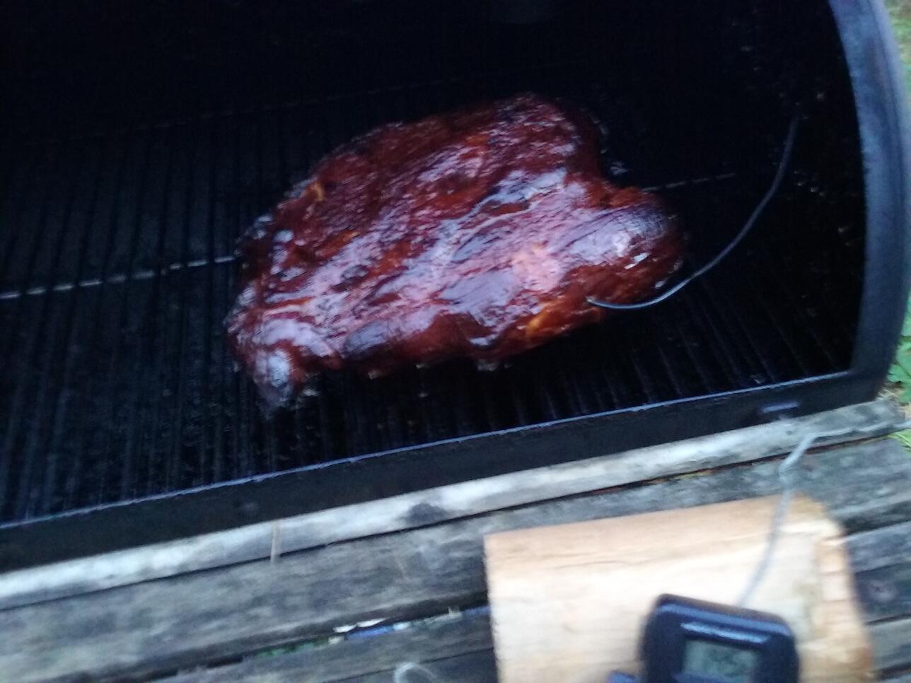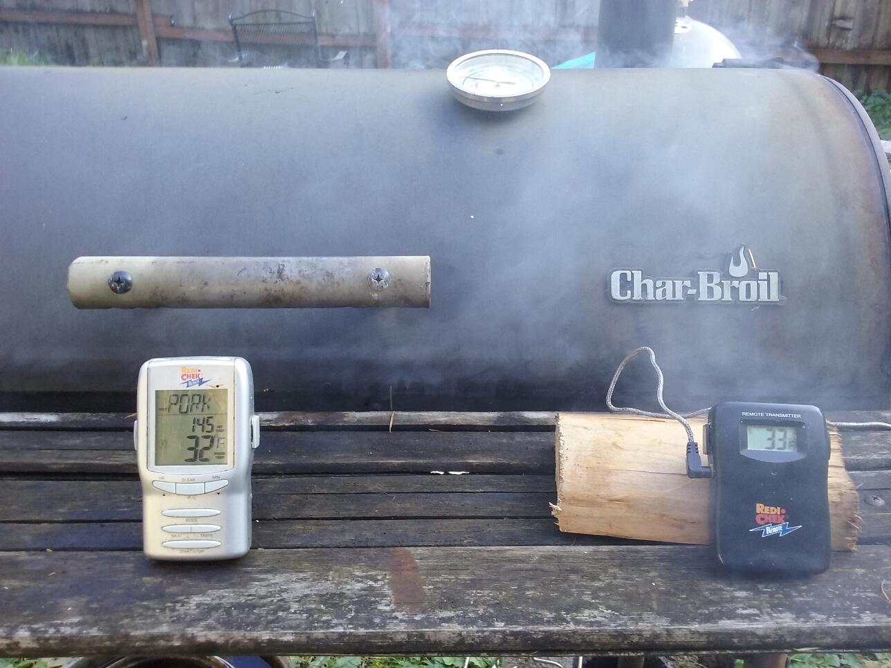 Place the ham and insert the meat probe. I use a digital meat probe that transmits the temperature to the reciever. The reciever has all the alarm setpoints on it. That means watch the game and not the meat. I do check the grill temperature and smoke about every 20 minutes.