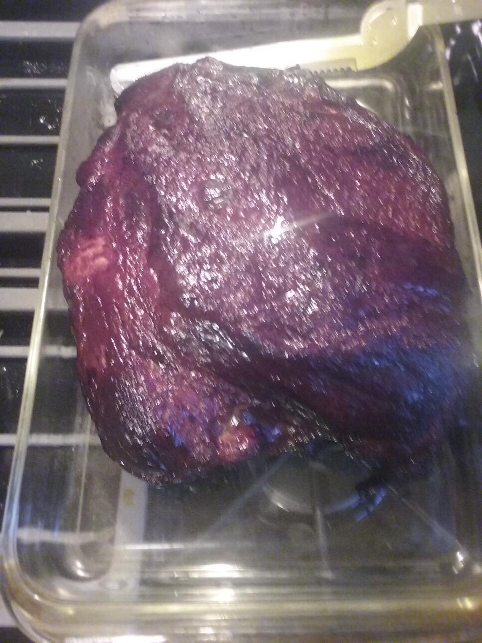 The finished product. Added coals a couple times to maintain heat. The last hour bumped the heat up to 320F to finish the cooking. Pulled the ham off at 145 F internal temperature and smothered it with a pineapple sauce. 20 oz can of pineapple minced in a food processor. 1 cup brown sugar and 1 cup water. Put the pineapple, water and brown sugar in a sauce pan and reduce. Dump it on the sliced ham.