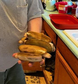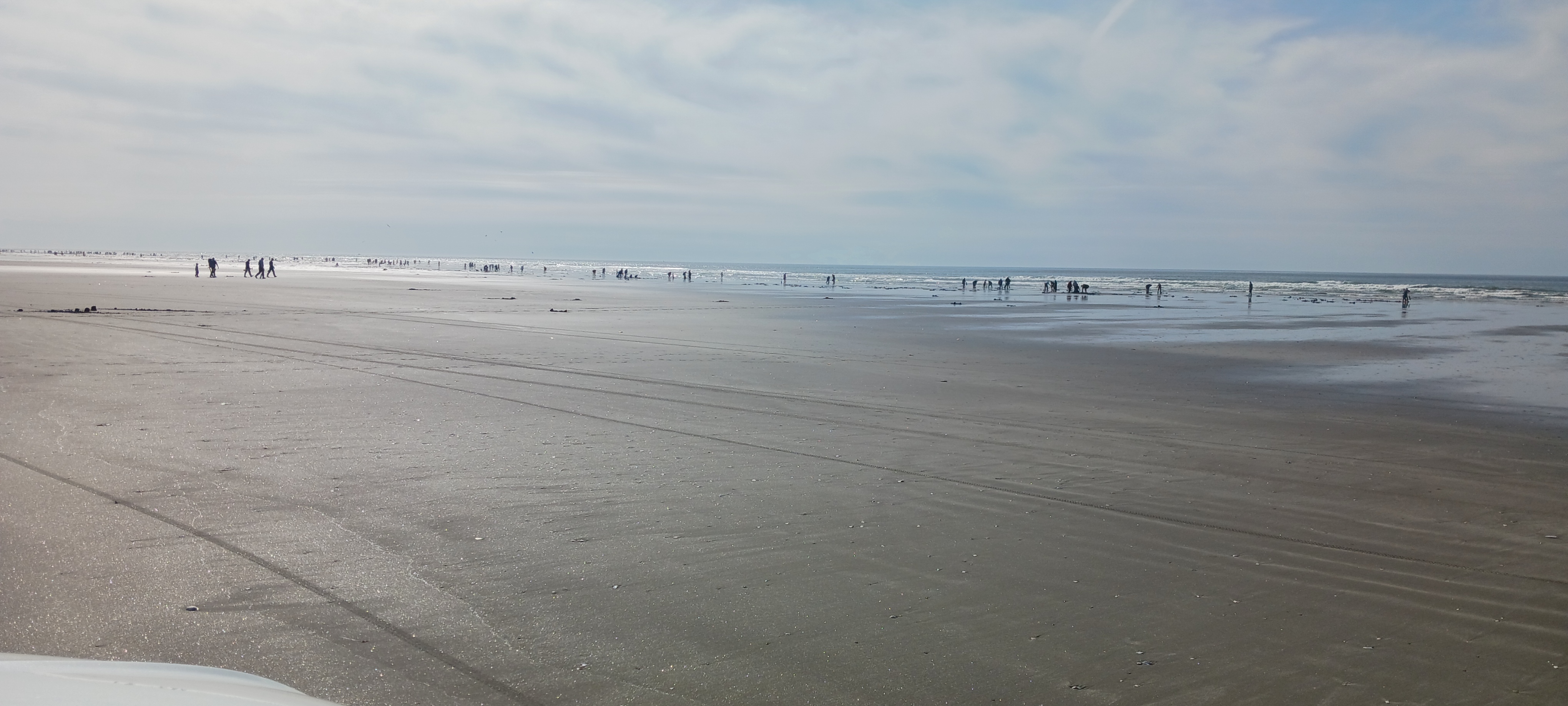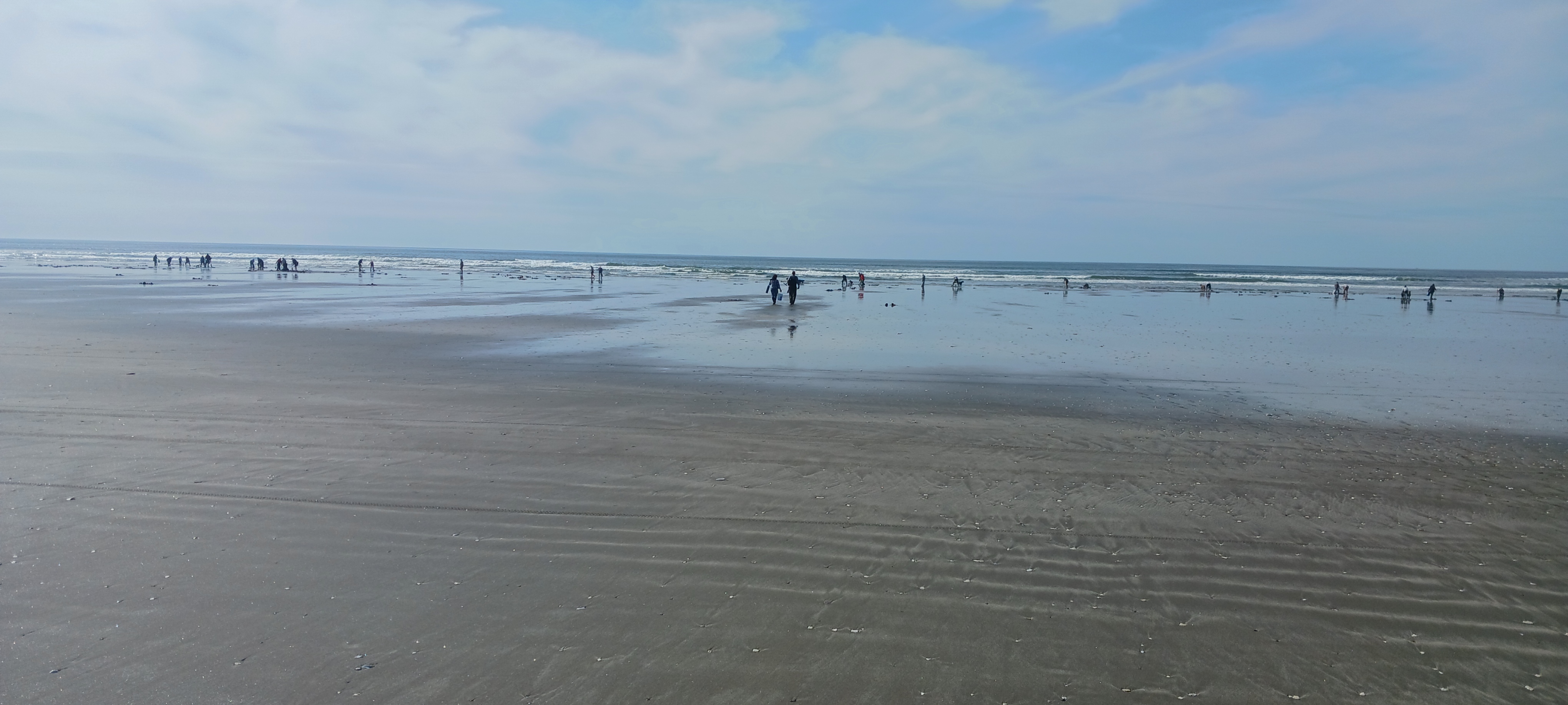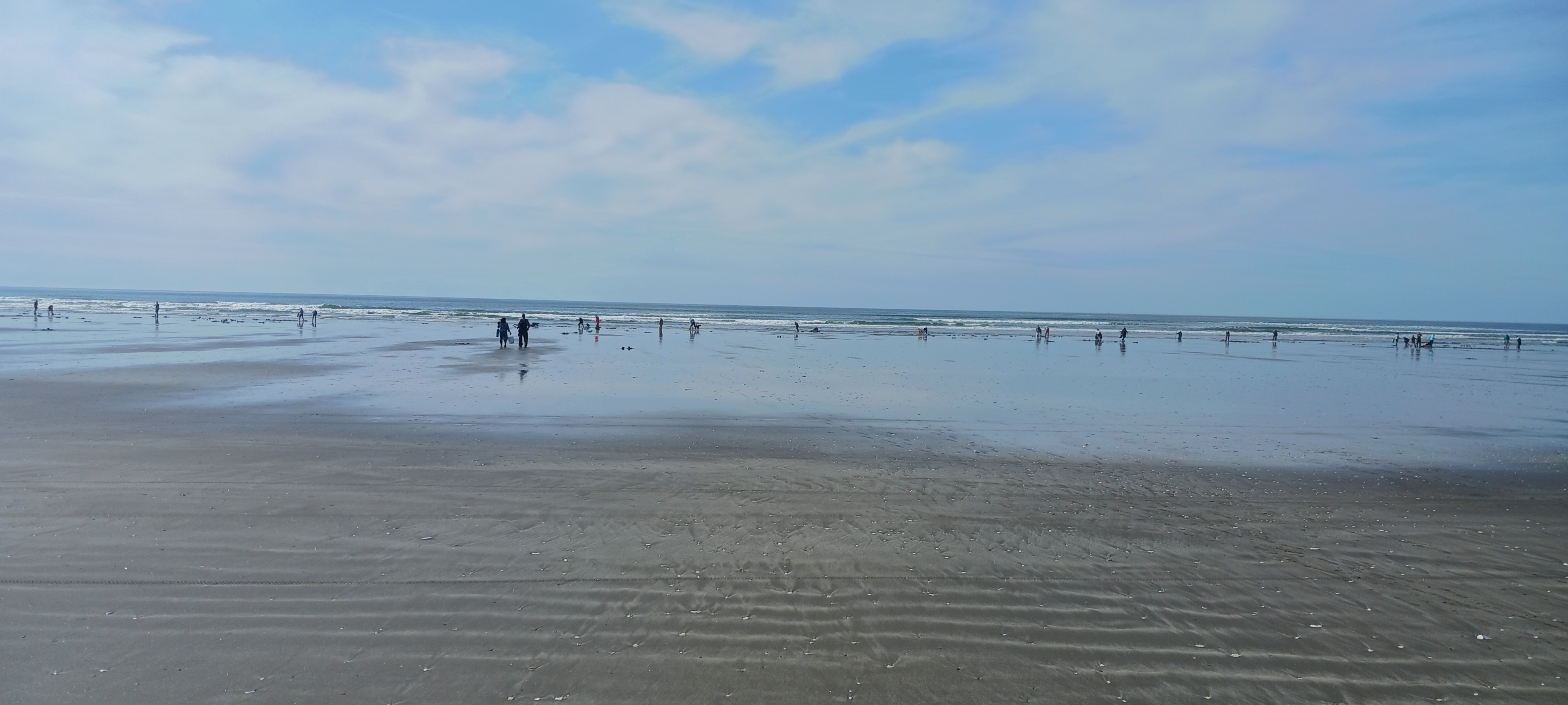 A day at the beach with the new 500 caliber semi auto clam howitzer. Pounding and poking the surf line with the high dollar red handled golf club thingy bought at the Aberdeen Goodwill for a dollar two ninety eight. Them furry nosed Siliqua patula marine bivalve molluscs a.k.a. Razor Clams were all waiting for us, teasing us with the little dimple shows. Followed by a blast from the 500 caliber (5 inch) clam howitzer and POP there it is. Sometimes the fuzzy nose of the desperately digging bivalve will be poking out in the bottom of the hole the clam howitzer just blasted open. The harvester, like myself, will dive madly to the ground, getting covered in sand and reaching up to a shoulder deep to grab the victim. Other times the fuzzy nosed mollusc can be seen in the plug of sand the semi automatic 15 round (limit) clam howitzer blasts out of the surf on to the ground. The fury of the clam diggers is reminiscent of the Pixar movie with seagulls all diving on the same morsel of food, echoing the sound of: mine, mine, mine mine, mine! In the fury of digging the limit is reached and the beautiful day on the beach comes to close is short order. Now its time to stop and head back out to the surf and rinse all the beach debris from the clams, gear and yourself - if possible. Load all the gear and bivalves into the beach rig and head to the house. Fortunately having the foresight to stop at Brady's for some smoked oysters and steelhead salmon I had something to munch on for the 3 hour trip home. It was a beautiful drive home, the mountain (Mt Rainier) was out and not a cloud in the sky.